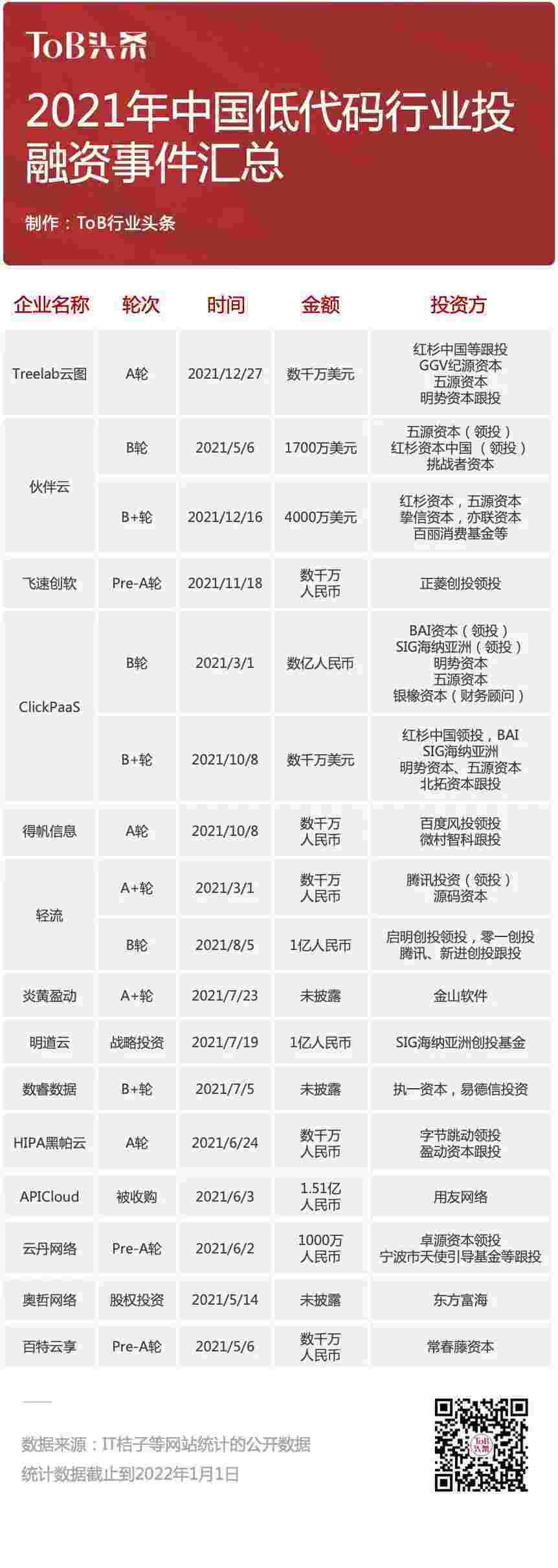 同期的国内市场同样战绩频频,,,,,,,,从2018-2020年,,,,,,中国无/低代码领域总体投融资事件共16起。。。。。。。。